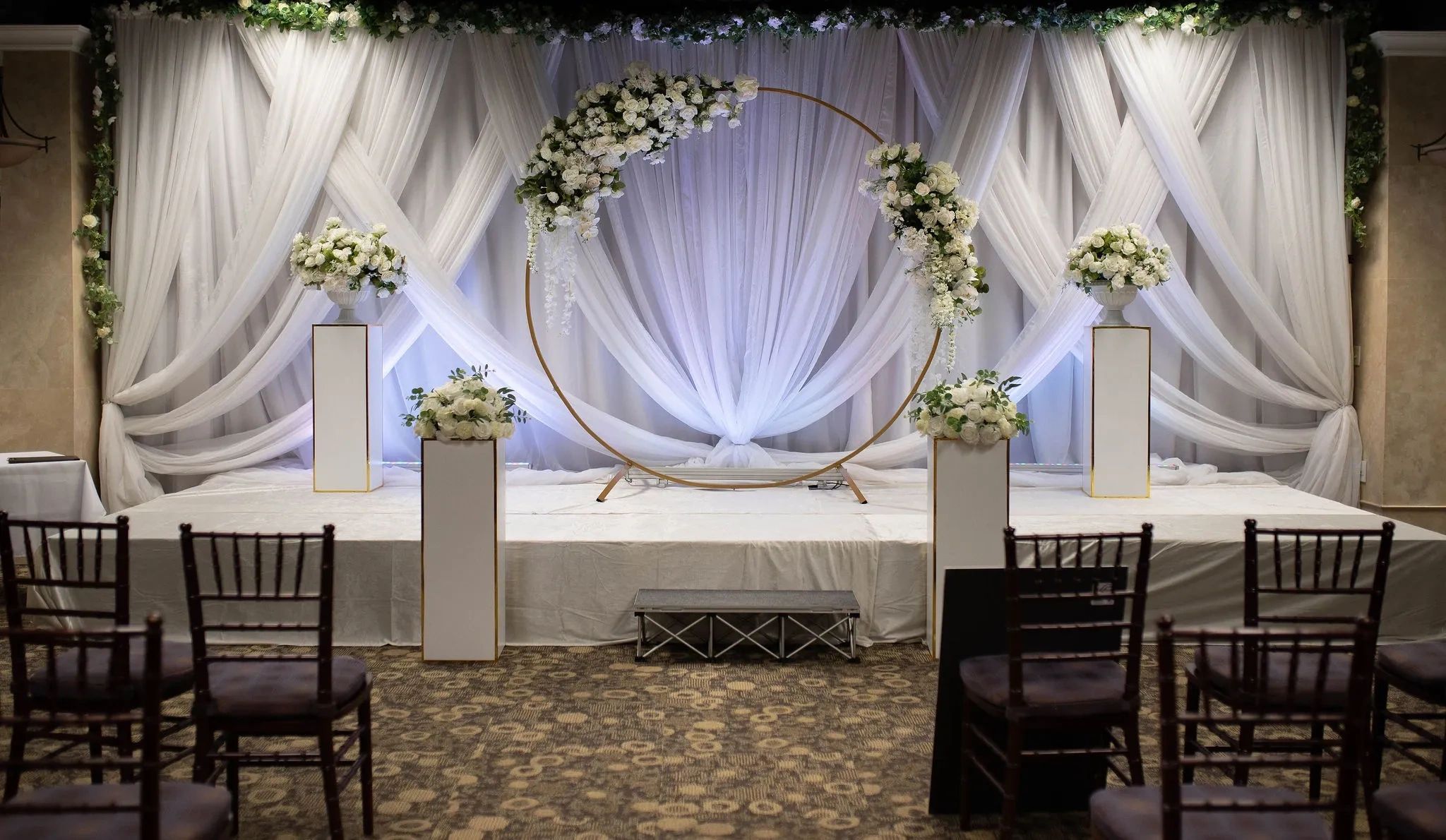 Our conveniently located venue boasts a magnificent 10,000 square foot banquet room, two satellite meeting rooms, a grand foyer, a spacious kitchen, an opulent platinum suite, and an elegant executive groom's room.